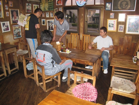 昔の学校で使われていた机やイスで食べるラーメンは不思議な感じがします。