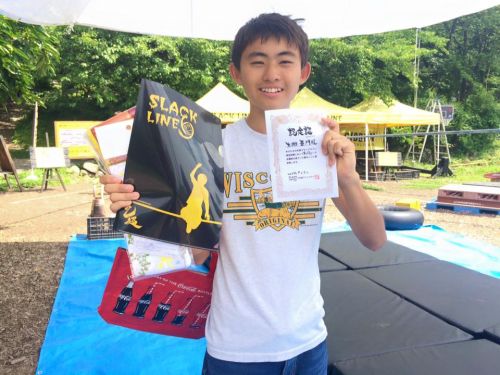 スラックライン検定認定第132号(初級)に合格した高校生の亜門くん。軽井沢から来てくれた亜門くんは、一年間のアメリカ留学を終え数日前に帰国しました。中学生時代にスケートで鍛えた体幹の強さが発揮されました。次回はお父さんも検定受講お待ちしております。亜門くんおめでとう(*^o^*)
