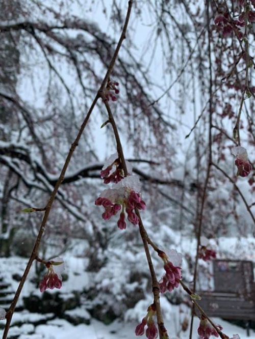 枝垂れ桜に雪! 水芭蕉に雪! 春がそこまで訪れたのに真冬に逆戻り。 水分の多い雪のため除雪も大変です。 平穏な日常が訪れますように。