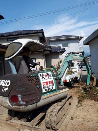 ニッコリと人生ゲームを持つ姉弟の自宅も、1階は床を剥ぎ泥を書き出す作業をされています。