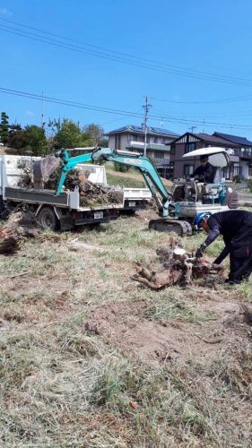 持ち前の笑顔とチームワークで、20本以上あった木の抜根作業も1日で完了。