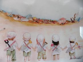 がれき処理場のすぐ近くの道路沿いには、子どもたちの描いた絵が飾られています。とても明るい色遣いで描かれているものが多くあるのが印象的でした。どんなことを想像してかいたのかな…と微笑ましく見ていました。どれも元気をもらえるすばらしい作品ばかりです。心に深い傷を負いながらも、それでも必死に前を向き、明るい未来を目指す子どもたち。そんな子どもたちの気持ちに応えたいと思いました。この未来を担う子どもたちのために、今私たちは何ができるのだろう…。そんなことを考えながらまだ雪の舞う女川を後にしました。
