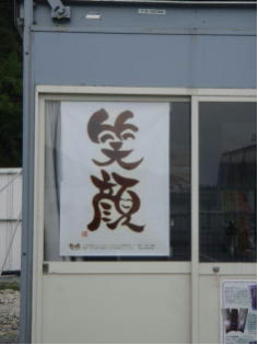プレゼンテーションルームとして建てられたプレハブ入口に、見慣れた「笑顔」がありました。側面にも林さんの言葉があり、継続した支援を続ける笑顔プロジェクトと女川の太いつながり