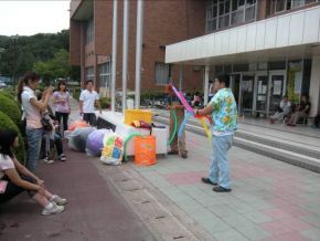 12時過ぎに総合体育館前で炊き出しを行っていた炊き出し班、風船班と合流。振る舞いは好評で予定より早くなくなってしまい、皆片づけに入っていました。 時間もあるということで、急遽総合体育館前でまっぴんさんの風船ショーが始まりました。風船が割れても大丈夫。ワッシーさんの音楽アシストで大盛り上がりです。 まっぴんさんの手にかかると、風船がいろんなものに変身し、魔法みたいです。体育館の前で休憩していたおじいちゃんおばあちゃんも、微笑みながらまっぴんさんのショーを見ていました。 | ![]() |